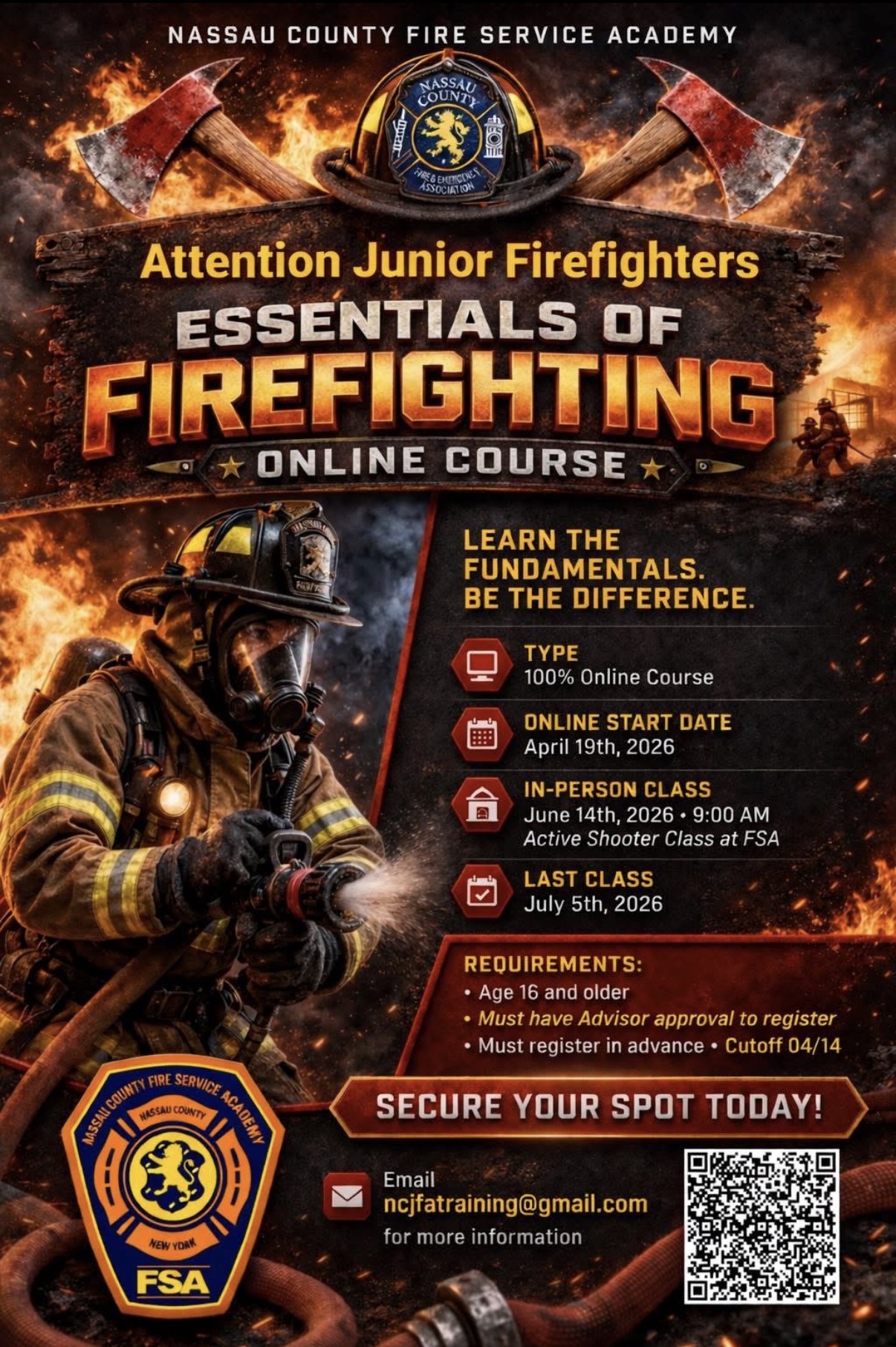 Essentials of Firefighting online class. Starts April 19,2026 , Ends July 5, 2026, MANDATORY IN PERSON CLASS at FSA June 14, 2026. Must put in 3 hours a week to keep up on assignments . Must be 16 or 17 years old. See your advisor for more details.
